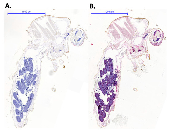 Whole Culex pipiens mosquito sections were stained with (A) a negative control probe that hybridized to the bacterial DapB RNA or (B) a positive control probe that bound to mosquito host GAPDH RNA. The bound probe was stained with Fast Red, and sections were counterstained with haematoxylin.