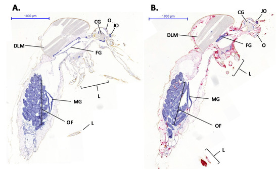 Culex pipiens mosquito sections treated with an RVFV-specific probe that binds to nucleoprotein RNA. Probe binding is shown by red staining. (A) A mosquito from the mock-infected control group. (B) An RVFV-infected mosquito. Organs labelled are CG, cerebral ganglion; JO, Johnston’s organ; O, ommatidia (compound eye); L, legs; FG, fore-gut; DLM, dorsal longitudinal muscle; MG, midgut; OF, ovarian follicle.