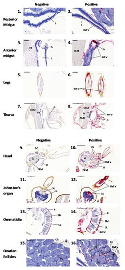 Higher magnification of tissues sections from Figure 2. Panels 1–4, midgut; panels 5 and 6, legs; panels 7 and 8, thorax; panels 9 and 10, head; panels 11 and 12, Johnston’s organ, including second segment of the antennae containing sensory cells; panels 13 and 14, ommatidia within the compound eye; panels 15 and 16, ovarian follicle. Abbreviations: AMG, anterior midgut; BM, basement membrane; Ch, chorion; CL, corneal lens; DLM, dorsal longitudinal muscle; FB, fat body, FE, follicular epithelium; G, ganglion JO, Johnson’s organ; L, lumen; O, ommatidia; PPM, pharyngeal pump muscle; Pr, proventriculus; OF, ovarian follicle; R, rhabdom surrounded by retinular cells; Sc, scolopophores; YG, yolk granules.