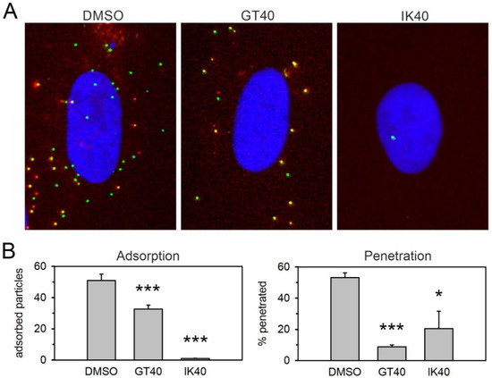 This striking discrepancy between PDGFRα-Fc and the PDGFRα-derived peptides concerning the effect of the S48Y mutation in gO suggested that they differ regarding their mode of action and their interaction sites on viral surface proteins. Therefore, we tested whether the PDGFRα peptides also inhibit viral entry in a similar way as previously observed for PDGFRα-Fc [9]. To discriminate whether the peptides act on adsorption, penetration, or both steps, we used a fluorescent HCMV mutant in which the capsid-associated tegument protein pp150 (UL32) is labeled with the green fluorescent protein EGFP and the abundant envelope protein gM (UL100) is labeled with the red fluorescent protein mCherry. This allowed us to count the total number of bound virus particles as a measure of adsorption (all green signals) and to determine the proportion of penetrated virions among those that had bound (green signals without red fluorescence). These analyses showed that the effect of IK40 is almost exclusively due to inhibition of adsorption, whereas for GT40 a large part of the effect is due to inhibition of the penetration step (Figure 2), similar to PDGFRα-Fc [9].