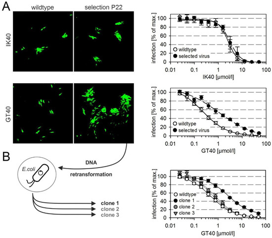 Selection of viruses with resistance against PDGFRα-derived inhibitory peptides. The proofreading-deficient virus RV-HGUL54dD413 (AD169), which expresses the green fluorescent protein under the HCMV-IE promoter, was cultured on HFFs with peptides IK40 and GT40 at submaximal inhibitory dose (25 µmol/L) for a period of 22 passages. Upon selection under GT40, enlarged foci were observed from passage 18. (A) Microscopic fluorescence images show the focal growth of wildtype and selected virus as reflected by EGFP expression, and the corresponding dose–response curves show the inhibitory effect of the respective peptide on wildtype and selected virus on cell-free infection of HFFs (n = 6; error bars = standard error of the mean). (B) To isolate genetically homogenous clones from the GT40-selectant, viral DNA was prepared from infected cell cultures and introduced into E. coli by electroporation. From bacteria with bacterial artificial chromosomes (BACs) containing intact viral genomes, DNA was prepared and transfected into fibroblasts to reconstitute virus. Viruses were then analyzed for sensitivity to the inhibitory peptide GT40 by dose–response experiments (n = 4; error bars = standard error of the mean). One of three clones showed reduced susceptibility to GT40, while the other two clones were almost indistinguishable from wildtype virus.