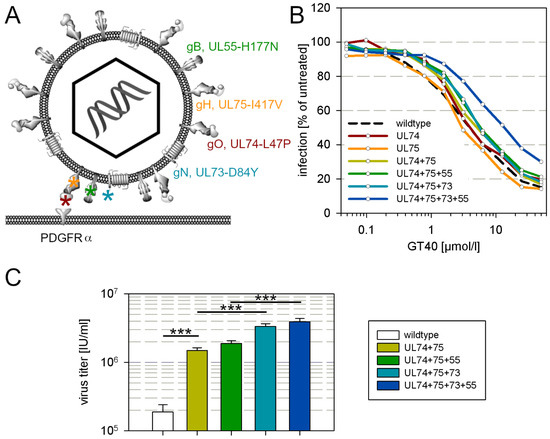 To test whether these mutations confer a reduction in sensitivity to GT40, we performed marker transfer experiments by introducing them into the genetic backbone of the proofreading-intact pHB5 clone of HCMV strain AD169 and analyzed the reconstituted mutant viruses for sensitivity to GT40. As PDGFRα-Fc binds to the gH/gL/gO trimer in the viral envelope, we first introduced the mutations in gO (L47P) and gH (I417V) alone and in combination into pHB5, which only had a marginal effect on the sensitivity to GT40 as compared to wildtype virus (Figure 4B). Further addition of H177N in gB and D84Y in gN caused a further slight shift of the dose–response curve towards higher EC50 values, but only when all four mutations were combined did the reduction in sensitivity become clear, with a four-fold increase in the EC50 (Figure 4B), which resembled the reduction in sensitivity measured with the selected virus (Figure 3A) and the purified clone in which the mutations have been found (Figure 3B). To further corroborate these findings by a different assay, we compared the UL74 + 75 mutant, the UL74 + 75 + 55 mutant, the UL74 + 75 + 73 mutant and the complete UL74 + 75 + 73 + 55 mutant regarding their ability to grow and produce progeny in a multistep growth analysis. HFFs were infected with each mutant and wildtype virus at a low infection multiplicity of 0.01 infectious units per cell, resulting in 1% infected cells in each culture. GT40 was added at submaximal inhibitory concentrations (25 µmol/mL), virus supernatants were harvested at 11 and 12 d after infection, and the virus titers were compared. In this assay, already the UL74 + 75 mutation facilitated viral growth under these conditions by factor 10 and this was further enhanced by the UL73-mutation, whereas the UL55-mutation had only a slight, nonsignificant effect (Figure 4C).