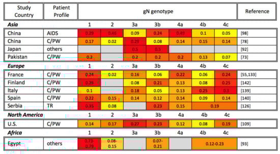 Global gN genotyping across disease states. gN genotyping studies are organized alphabetically by study continent and country, as well as by patient profile (TR: transplant recipient; AIDS: AIDS patient; C/PW: congenital CMV infection or pregnant woman). The percentage of each gN genotype among study participants is shown, with the most common genotypes highlighted in red, genotypes at intermediate frequency in orange, and less common genotypes in yellow. Gray cells indicate that a particular gN genotype was not identified in the reference studies. Note that the sum of all genotypes may be greater or smaller than 1 if multiple gN genotypes were identified in the same sample or if not all samples in a study were genotyped, respectively.