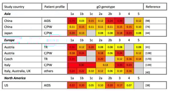 Global gO genotyping across disease states. gO genotyping studies are organized alphabetically by study continent and country, as well as by patient profile (TR: transplant recipient; AIDS: AIDS patient; C/PW: congenital CMV infection or pregnant woman). The percentage of each gO genotype among study participants is shown, with the most common genotypes highlighted in red, genotypes at intermediate frequency in orange, and less common genotypes in yellow. Gray cells indicate that a particular gO genotype was not identified in the reference studies. Note that the sum of all genotypes may be greater or smaller than 1 if multiple gO genotypes were identified in the same sample or if not all samples in a study were genotyped, respectively.