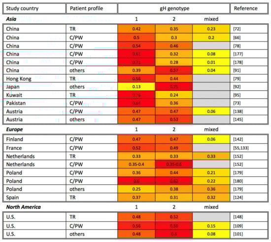 Global gH genotyping across disease states. gH genotyping studies are organized alphabetically by study continent and country, as well as by patient profile (TR: transplant recipient; AIDS: AIDS patient; C/PW: congenital CMV infection or pregnant woman). The percentage of each gH genotype among study participants is shown, with the most common genotypes highlighted in red, genotypes at intermediate frequency in orange, and less common genotypes in yellow. Gray cells indicate that a particular gH genotype was not identified in the reference studies. Note that the sum of all genotypes may be greater or smaller than 1 if multiple gH genotypes were identified in the same sample or if not all samples in a study were genotyped, respectively.