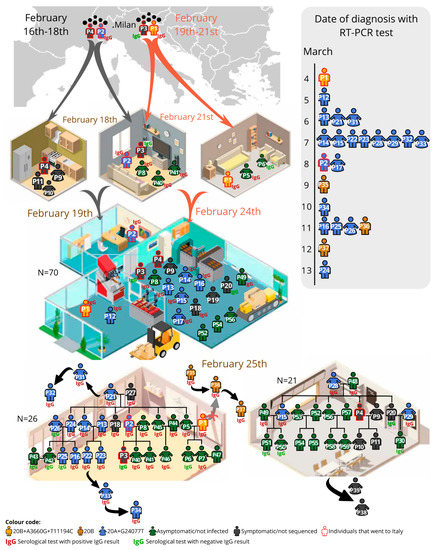 Only 3 out of the 54 non-family-related co-workers developed symptoms and had a positive RT-PCR (P12–P17–P19; P12 and P17 provided a blood sample and had a reactive serological test), in comparison with 11 out of 16 family-related co-workers (additionally, the asymptomatic P8 and P49 were later shown to be IgG-reactive). The social gatherings probably contributed to most of the infection transmissions: in Family1 (n = 26) there were 13 infected individuals (including P1–P2) confirmed by RT-PCR, one symptomatic not tested (P3) and eight asymptomatic but IgG-reactive; in Family2 (n = 21) there were five RT-PCR confirmed cases, and two asymptomatic but reactive for IgG.