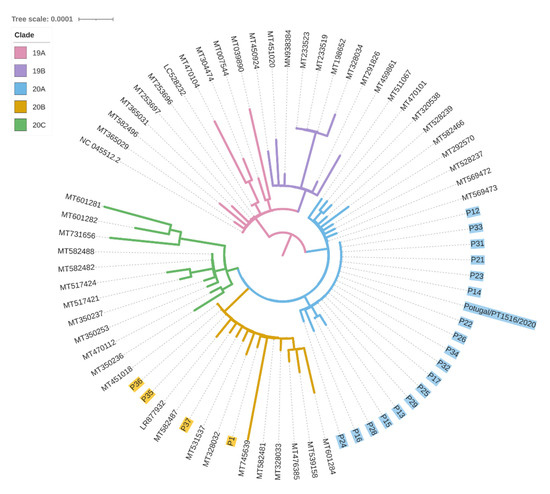 Phylogenetic tree of the SARS-CoV-2 whole sequences isolated from the samples analysed here and other sequences from GenBank.