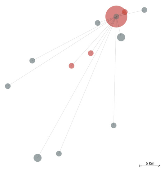 The geographic distance between individuals infected by the SARS-CoV-2 20A+G24077T lineage, including the 18 belonging to the studied infectious cluster (in red) and 11 other individuals (in grey) out of 150 Covid-19 Northern Portuguese cases identified during the same period (till 16 March 2020). The size of the circle is proportional to the effective size observed at a specific point, while lines represent the linear geographic distance from the bulk of the infectious cluster.