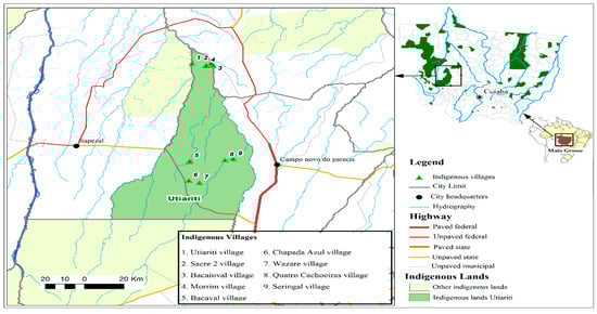 Geographical location of Mato Grosso Indigenous lands, highlighting Utiariti Indigenous land and nine villages of the Haliti-Paresí community in the southeastern region of the Brazilian Amazon, 2014–2015.