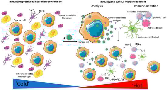 Breast cancer is a heterogeneous disease where the majority of tumours are immunologically “cold,” and therefore the use of immunotherapeutics within breast cancer appeals to be less compelling than those of melanoma or lung cancer. However, OV has been shown to modulate the tumour microenvironment (TME), causing an increase in pro-inflammatory cells (e.g., cytotoxic T cells, macrophages) that could potentially turn a “cold” tumour into a “hot” one (Figure 1). In breast cancer, there is a number of preclinical studies using oncolytic virotherapy as well as a few early-phase clinical studies with promising early markers of response [12,13,14,15,16,17,18]. This was reviewed recently by O’Bryan and Mathis [19], Martini [9], and Chaurasiya and Fong [20].
