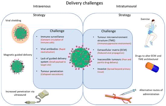 The approach to many novel therapies has been to ascertain safety, efficacy, and biological mechanisms of action through rigorous testing of oncolytic viruses as monotherapies. However, the actual efficacy of OV on its own is limited, as is the case with more established immunotherapies such as checkpoint blockade. Figure 2 outlines the challenges that need to be overcome and potential strategies for improved delivery of oncolytic viruses.