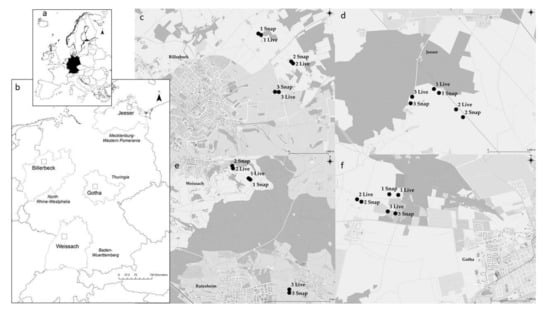 Map of the four study areas in Germany ((a), overview) and the corresponding federal states ((b), grey). In each area (Billerbeck (c), Jeeser (d), Weissach (e), Gotha (f)), trapping was conducted on three replicate sites (1, 2, 3) where live (Live) and snap (Snap) trapping was performed. Dark-grey areas present forests and light-grey areas are agricultural/grassland areas where the trapping was performed.