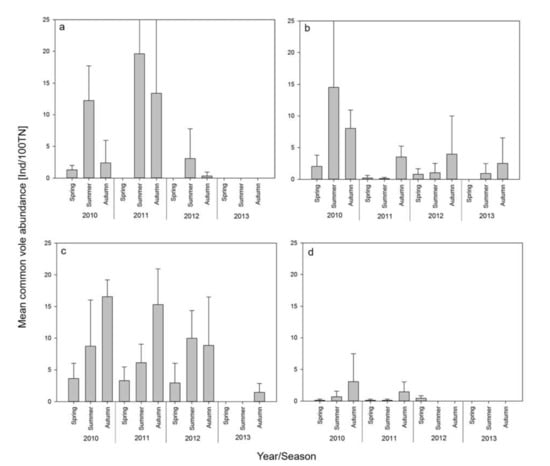 Site-specific common vole abundance estimates ranged from 0 to 46 individuals/100TN. Large variation between the three replicate sites of each area was observed (Table 1, Figure 2). The highest average common vole abundance was 20 individuals/100TN observed in Weissach during summer 2011 (Figure 2).