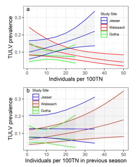 In contrast to our initial hypothesis, population-level TULV dynamics were not positively correlated to the current abundance. Our results suggest an overall positive delayed density dependence coupled with an overall negative direct density dependence (Table 2). This overall effect does appear to vary at lower spatial scales (interaction between abundance and site, Table 2). The generality of the assumption that high prevalence is always associated with high host abundance has been questioned repeatedly. Reil et al. [], for example, found a strong seasonality in positive direct density dependence of PUUV. The latest results on PUUV in bank voles in Finland suggest that transient maternally derived immunity is a key feature of missing density dependence in populations []. For Sin nombre orthohantavirus (SNV) and its associated host, the deer mouse (Peromyscus maniculatus), a similar density dependence structure to the one presented here was described. Luis et al. [] identified a strong delayed effect of deer mouse density on the prevalence of SNV. This is attributed to population fluctuations where the virus frequently becomes locally extinct due to missing host individuals. In such nonequilibrium, transient dynamics, peak host densities might not directly correspond to peak prevalence, as the virus survives at the metapopulation level rather than at a site-specific level. In these situations, immigration of nearby infected individuals is required, generating a time lag between the increase in host density and virus transmission at a particular site. Our data suggest that low winter survival in common vole populations with subsequent low spring abundances (Figure 2) could present such a bottleneck for site-specific TULV persistence. In this case, TULV might completely disappear from a plot and would need to be newly introduced by immigrating common voles from adjacent sources during the repopulation process [,]. Thereafter, it might take some time for the virus to spread within a newly established host population and, hence, the increase of TULV seroprevalence might be delayed in the following season. Given that the modern agricultural landscape supports a mosaic of suitable habitats for common voles, the degree of density dependence as well as the time lag is likely to vary between individual field sites depending on the distance to the nearest refuge as a source for recolonization to occur []. At a larger scale, this can be confirmed for TULV, as the different study areas varied in their expression of density-dependent patterns, likely reflecting differences in the landscape suitability structure and vole dynamics (Table 2). These results highlight that land-use patterns at the local and regional scale can have a large impact on the underlying pathogen dynamics and molecular evolution. Future work should therefore consider aspects of land use as explanatory variables for pathogen dynamics. However, our study had several limitations. Trapping could not be performed continuously at all sites in the last year of the study and the trap success and resulting lack of available sequences from the Billerbeck site might affect the large-scale applicability of the results. As this particular site was also characterized by a high prevalence of PUUV [], the lack of samples limited the ability to investigate potential reassortment, though earlier publications using full genomes of TULV (and PUUV) or sequences from all genome segments have not provided evidence that reassortment is a common, or at least reasonably frequent, phenomenon in Central European phylogenetic clades and populations of these two orthohantavirus species [,,,].