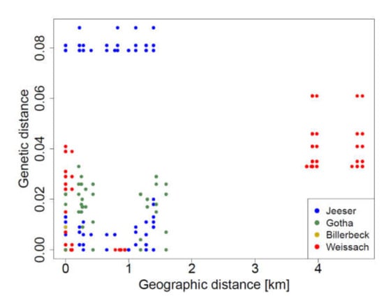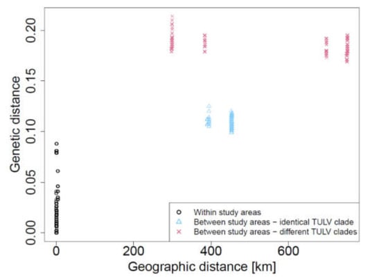 Sequence variation in TULV S segment followed a strong isolation-by-distance relationship across all studied areas in Germany (r2 = 0.619; Mantel test p < 0.0001; Figure 4). Consistent with larger geographic patterns of TULV variation [], comparisons between study regions harboring different phylogenetic clades (TULV-CEN.S in the areas of Weissach and Billerbeck; TULV-CEN.N in the areas of Jeeser and Gotha) showed larger genetic divergence (p-distance: 18%–22%) than comparisons within TULV clades (p-distance: <13% between study areas). At the local scale, analysis revealed a highly significant isolation-by-distance pattern when all areas were tested jointly (r2 = 0.069; Mantel test p < 0.0001; Figure 5). Separate Mantel tests according to study area demonstrated that this was largely driven by data from Weissach with up to four kilometers distance between sampling sites (r2 = 0.576; p < 0.0001). Sequences from the other study areas with shorter maximum distances among sampling sites showed no significant isolation-by-distance patterns (Jeeser: r2 = 0.001; p = 0.274; Gotha: r2 = 0.005; p = 0.512; Billerbeck: n = 2 sequences, insufficient for statistical testing).