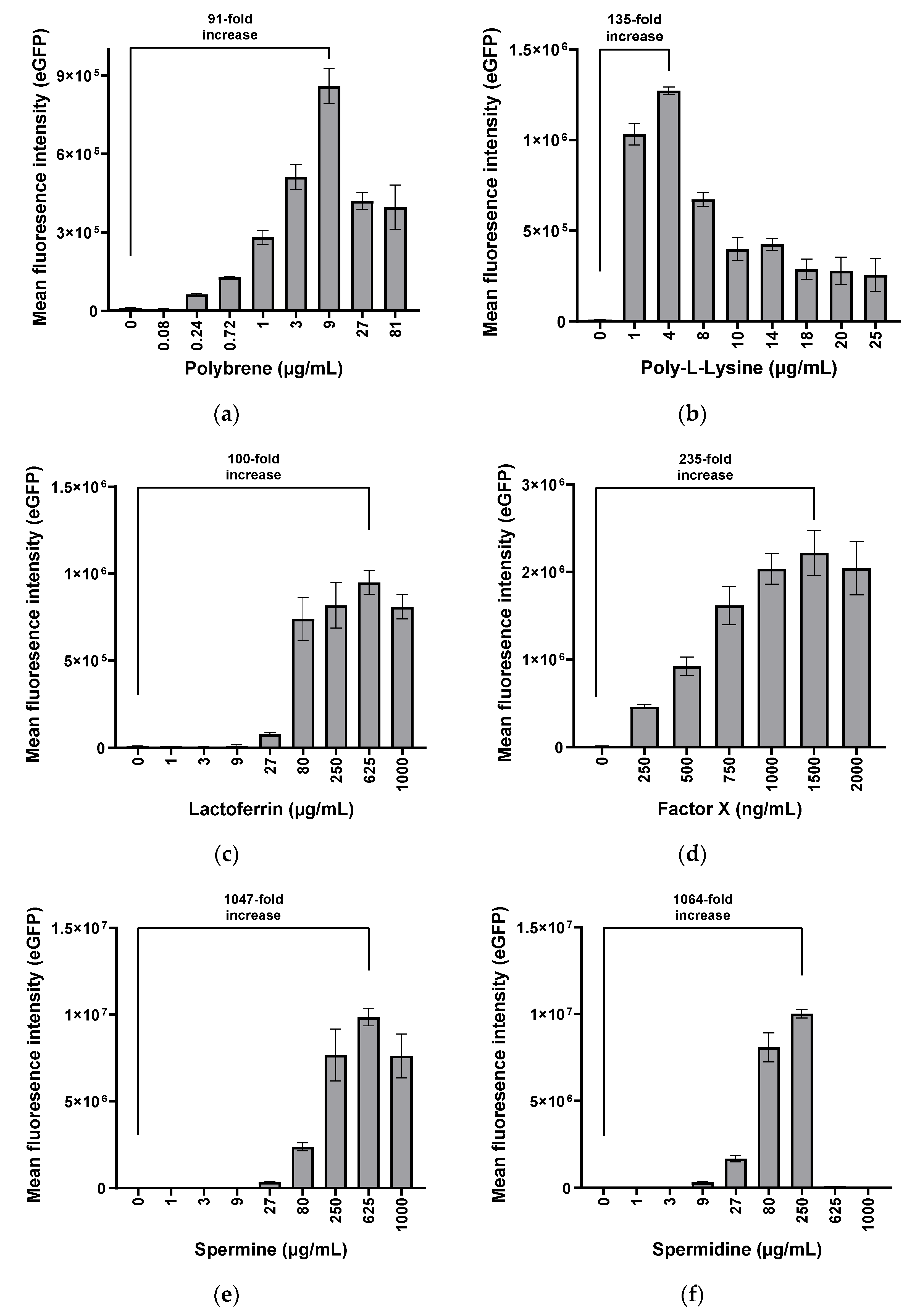 3.1. Polybrene, Poly-l-Lysine, Lactoferrin, Factor X, Spermine, and Spermidine Are Potent Enhancers of hMSC Transduction with HAdV-5 Vectors
