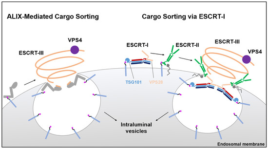 The respective roles of ALIX and ESCRT-I in the sorting of membranous cargo. Upon internalization, ubiquitylated cargo is detected by ALIX (left) and ESCRT-I (right) for compartmentalization into intraluminal vesicles that are destined for degradation via the late endosome. Both ALIX and ESCRT-I contain ubiquitin binding domains that facilitate this first step. Unlike ESCRT-I, ALIX possesses an ESCRT-III binding domain that allows for the direct recruitment of ESCRT-III and VPS4, the machinery required for sealing of cargo within intraluminal vesicles and abscising these vesicles from the endosomal membrane. In a similar fashion, the ESCRT-I component TSG101 binds ubiquitylated cargo, while the VPS28 component can recruit ESCRT-III through ESCRT-II which also binds ubiquitylated cargo as well as phospho-inositol lipids.