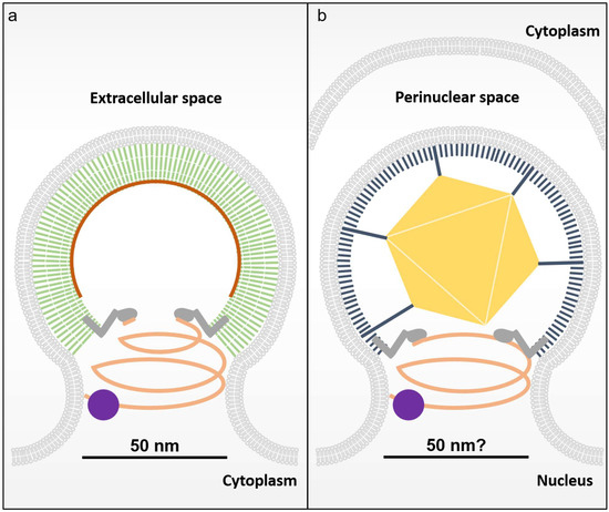- Hagen, C.; Dent, K.C.; Zeev-Ben-Mordehai, T.; Grange, M.; Bosse, J.B.; Whittle, C.; Klupp, B.G.; Siebert, C.A.; Vasishtan, D.; Bäuerlein, F.J.B.; et al. Structural Basis of Vesicle Formation at the Inner Nuclear Membrane. Cell 2015, 163, 1692–1701. [Google Scholar] [CrossRef]