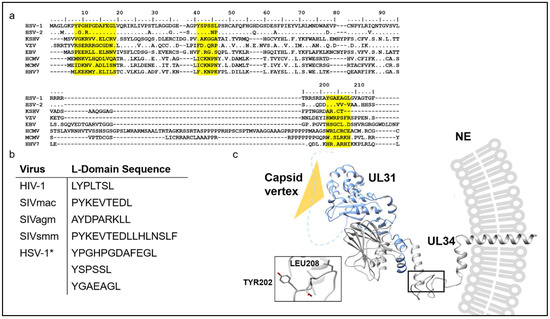 Unlike RNA viruses, particle formation of the DNA virus HSV-1 begins in the nucleus (Figure 2b) [31]. Therein, after having undergone lytic reactivation, the newly synthesized viral DNA is packaged within the viral capsid [32]. In order to produce infectious progeny virions, it is theorized that the nuclear viral capsid must pass through the nuclear envelope through a membrane budding pathway, since HSV-1 capsids are too large to traverse the nuclear pore complex [33]. To do this, herpesviruses assemble a nuclear egress complex (NEC) from viral UL31 and UL34 proteins (HSV-1 nomenclature) [30]. UL34 localizes to the inner nuclear envelope via its C-terminal type II single-pass membrane anchor [34]. UL31 binds to HSV-1 capsid vertices but also associates with membrane bound UL34 and effectively acts as a dynamic scaffold between the inner nuclear membrane and the viral capsid [31]. Additionally, the UL31-UL34 heterodimer forms a lattice about the inner nuclear membrane in a manner structurally reminiscent of HIV-1 Gag assembly sites (Figure 2a,b) [31,35,36]. In order to efficiently bud across the nuclear envelope, HSV-1 and Epstein-Barr Virus (EBV) were recently shown to recruit the early acting ESCRT protein ALIX and ESCRT-III associated protein VPS4 directly to the NEC via interactions with UL34 [37,38]. Remarkably, EBV BFRF1 (UL34 in HSV-1), was also shown to recruit the NEDD4-like ubiquitin ligase ITCH, and that ubiquitination of BFRF1 regulates the formation of nuclear envelope-derived vesicles during virus maturation, drawing yet another parallel with retroviral budding [39]. Depletion of ALIX resulted in the loss of the downstream ESCRT-III component required for membrane scission, CHMP4B, and reduced HSV-1 and EBV replication. Additionally, in the case of HSV-1, impairment of the membrane scission machinery VPS4 resulted in a significant accumulation of enveloped virions in the nucleus, some of which remained tethered to the inner nuclear membrane [37], suggesting a role for ESCRTs in herpesvirus nuclear egress. However, despite clear biochemical data describing physical interactions between ALIX and UL34, no L-Domain sequence was identified. The remainder of this review focuses on comparing the nuclear egress of HSV-1 capsids to that of retroviral budding sites and proposes the existence of an ALIX binding site within UL34 that could support the model of ALIX recruitment to herpes-viral NECs.