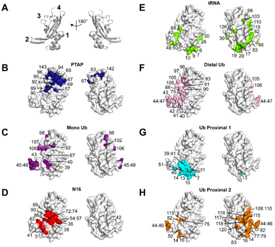 Binding capabilities of the Tsg101 UEV domain. Panel (A), UEV (gray) secondary structure elements (PDB ID: 1KPP [17]); numbers identify approximate locations of structural elements unique to the UEV domain compared to canonical E2 enzymes: 1, N-terminal α-helix-1; 2, β-hairpin; 3, vestigial active site; 4, P(T/S)AP-binding pocket. Panels (B–H), the same UEV structure (gray) is rendered in space-filling mode with recognition determinants of the indicated partner colored. Panels (B–E) highlight large chemical shift perturbations of Tsg101 measured by NMR of (B) a PTAP peptide, (C) monoubiquitin, and (D) N16, also known as tenatoprazole ((B–D), [23]), (E) tRNA [15]. Panels (F–H) highlight residues identified to be in (F) distal, (G) proximal site 1 and (H) proximal site 2 di-Ub binding sites and used as restraints for rigid-body docking and structure refinement.