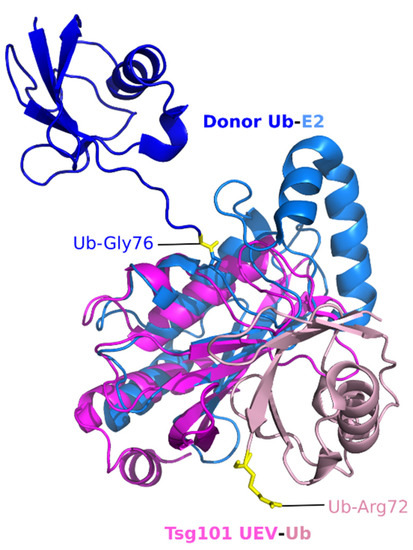 Superimposition of the hTsg101 UEV domain complexed to Ub and canonical E2 (UbcH5) complexed to Ub. Tsg101 is dark pink, the complexed Ub is a light pink; E2 is light blue, the complexed Ub molecule is dark blue. UEV-Ub, PDB ID: 1S1Q [32]; E2-E3-Ub (E3 not shown), PDB ID: 3JVZ [34]. The donor Ub Gly76 residue thioesterified to the E2 is yellow. The C-terminus of the Ub moiety partnered with the UEV is flexible and therefore not apparent in the crystal structure. The last ‘rigid’ residue, R72, is highlighted to give the reader an idea of where the C-terminus lies.