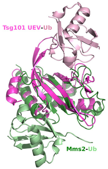 Superimposition of the hTsg101 UEV domain complexed to Ub and hMms2 complexed to Ub. Tsg101 is pink, Mms2 is green and the two Ub molecules in each PDB are lighter versions of the same colors. UEV-Ub, PDB ID: 1S1Q [32]; Mms2-Ub, PDB ID: 1ZGU [46].
