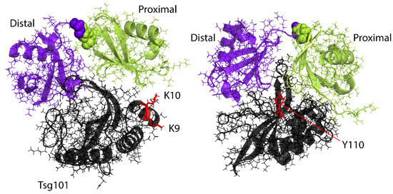 Binding modes of Lys63-linked di-Ub on the Tsg101 UEV domain. (Left), Di-Ub complex with proximal domain in contact with N-terminal region; (Right), Di-Ub complex with proximal domain in contact with vestigial active site. Key determinants of recognition of the two binding modes (proximal-1, K9, K10; proximal-2, Y110, respectively) are highlighted in red sticks. PDB ID: 6UD0.