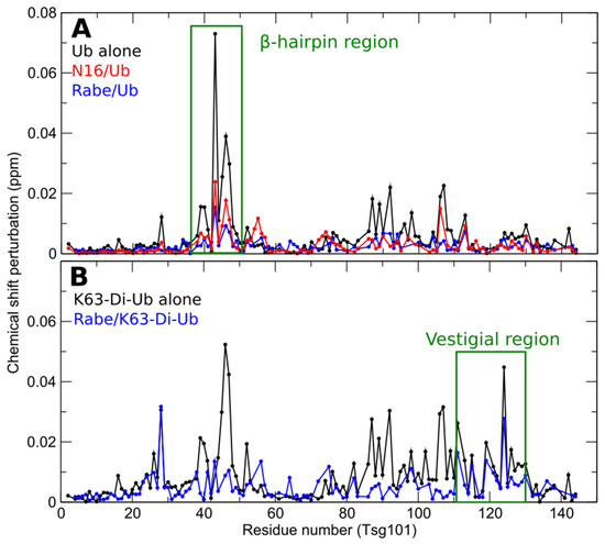 Prazoles block UEV binding of mono- but not di- Ub. Panel (A) Chemical shift perturbations of Tsg101 upon addition of ubiquitin, either alone (1:1 ratio–black), or when covalently precomplexed with tenatoprazole (N16, red) [23] or rabeprazole (blue). Panel (B) Chemical shift perturbations of Tsg101 upon addition of Lys63-linked di-Ub alone (black) or after first complexing with rabeprazole (blue).