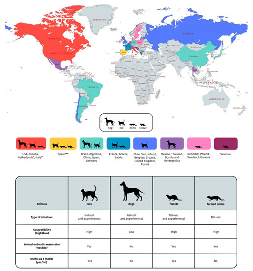 Figure 1. Summary of findings of the SARS-CoV-2 infection in companion animals (including cats, dogs, and ferrets) and farmed minks and reports of SARS-CoV-2 natural infection in these animals (25 May 2021) [19]. * Data of dog and cat isolation in the Netherlands are collected from [30,52]; ** Data of dogs isolation in Italy are collected from [27]; *** Data of pet ferrets isolation in Spain are collected from [63]. We certify that we stays neutral with regard to jurisdictional claims in this map.