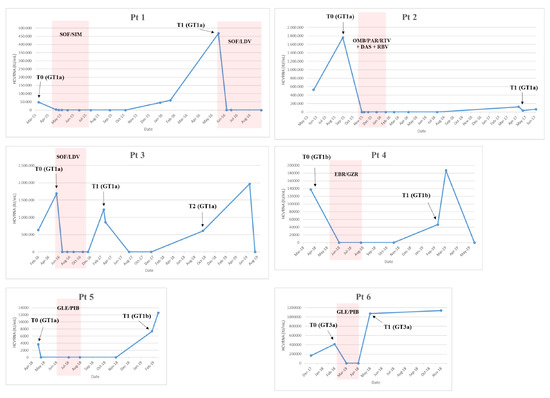 Patient HCV RNA viral load over time. The sampling times T0, T1, and T2 are indicated. The period and type of treatment are indicated in the red box. DAS: Dasabuvir; EBR: Elbasvir; GLE: Glecaprevir; GZR: Grazoprevir; OMB: Ombitasvir; PAR: Paritaprevir; PIB: Pibrentasvir; RBV Ribavirina; RTV: Ritonavir; SIM: Simeprevir; SOF: Sofosbuvir.