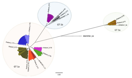 A phylogenetic analysis was performed to compare all clustered sequencing reads representing each patient sample (Figure 2 and Figures S1–S6). Patient-derived HCV NS5B Sanger sequences (indicated in Figure 2 as Patient_N-T0, Patient_N-T1, and Patient_N-T2) were also included, and, as expected, they grouped with the corresponding clustered sequences. From the phylogenetic tree, three clusters corresponding to three distinct genotypes resulted: GT1a, GT1b, and GT3a (orange, blue, and green areas, respectively, in Figure 2).