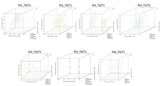 For Pt1, Pt2, and Pt4, it was ambiguous whether reinfection or late relapse had occurred when evaluating samples by phylogenetic analysis. However, low Z-score values (ZGT1a, ZGT1b, and ZGT3a scores < 2.58) suggested viral quasispecies detected at T0 and T1 were closely related for both Pt1 and Pt2. Genetic distances of the quasispecies detected in Pt1 samples appeared interspersed in the three-dimensional plot, while genetic distances of quasispecies detected in Pt2 samples were only partially separated (Figure 3). In contrast, the ZGT1b value for Pt4 was suggestive of reinfection.