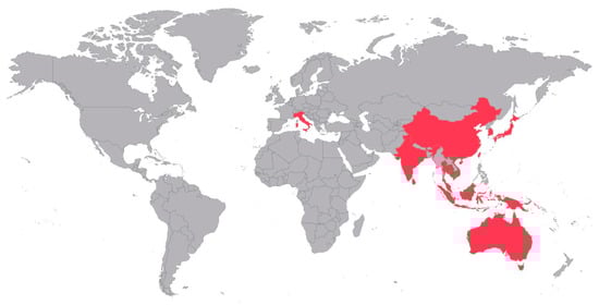 JEV was found in Cx. sitiens in East and South Asia, as well as in northern Oceania. The virus was found and/or isolated from mosquitoes in Malaysia [,], Taiwan [,], Papua New Guinea [] and Australia [,,,]. In Australia, Cx. sitiens was identified as a competent JEV vector using a virus strain isolated from Australian Och. vigilax and mosquitoes from a laboratory colony from Queensland [].