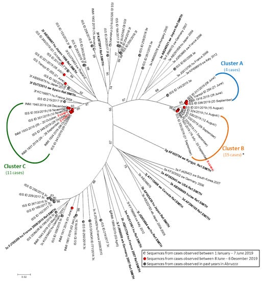 Three clusters (termed A, B, and C) can be recognized: cluster A and cluster B were caused by 3e strains and cluster C by 3f strains. In cluster B, all sequences were identical; in cluster A and C, intra-cluster heterogeneities were observed (0–3 nt differences among strains of cluster A; 0–6 nt differences among strains of cluster C). The mean intragroup distances in Cluster A (n = 4) and C (n = 11) were 0.0045 and 0.0057 substitutions/site, respectively. One sequence (ISS_ID 331/2019) had molecular features intermediate between cluster A and B.