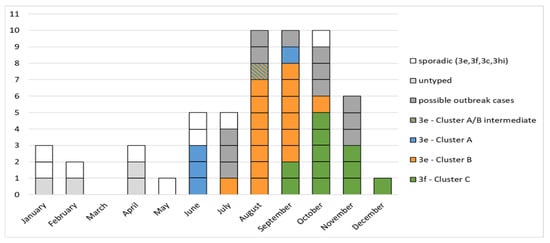 The three molecular clusters (Cluster A, B, and C) partially showed overlapped temporal distribution: three Cluster A cases occurred in June and a fourth case in September, 15 Cluster B cases occurred from July to October, and 11 Cluster C cases occurred from September to December.