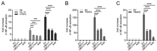 We set out to determine the ability of the viral enzyme UBCv1 to modulate immune responses. Initially, we assayed NF-κB activation in response to stimuli such as hIL-1β or hTNFα. HEK 293T cells were transfected with an NF-κB-luciferase reporter alongside with a 3XFlag-tagged UBCv1 or UBCv1 mutated in the cystein residue responsible of the catalytic activity (UBCv1mut) []. These cells were subsequently stimulated with 25 ng/µL IL-1β or 50 ng/µL TNFα for 6 h (Figure 1). As a positive control we used vaccinia virus (VACV) protein A49, a protein known to prevent p65 nuclear translocation by mimicking IĸBα and blocking its proteasomal degradation [,,]. Expression of UBCv1 decreased NF-κB activation in a statistically significant manner compared to cells transfected with an empty vector (EV) control (Figure 1A). This inhibition was also detected upon expression of VACV protein A49.
