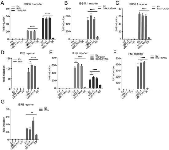 In order to determine the specificity of action on the innate immune response we transfected HEK293T cells with a reporter expressing luciferase under the promoter of the IRF3-dependent gene ISG56. The pathway was stimulated by co-transfection of several signaling molecules contributing to IRF3 activation including RIG-I, RIG-I-CARD (a constitutively active form of RIG-I), TRIFΔRIP, and cGAS/STING. The ability of UBCv1 to inhibit these pathways was assessed by its co-transfection alongside these inducers (Figure 2). In these experiments VACV protein C6, a well-known inhibitor of IRF3 signaling [], was used as positive control. Expression of these signaling molecules resulted in clear induction of ISG56 reporter activity, and this was not affected by expression of UBCv1 or its mutant form (Figure 2A–C). We then analysed the effect of UBCv1 overexpression on an IFN-β promoter reporter. Upon stimulation with the inducers RIG-I, TRIFΔRIP, cGAS/STING or RIGI-CARD, the IFN-β-Luc reporter induction was significant, but this was not altered in cells overexpressing 3XFlag-UBCv1 or the mutant form with respect to EV (Figure 2D–F). Finally, to determine the role of UBCv1 on the JAK/STAT pathway, we used an ISRE-dependent luciferase reporter. Cells were co-transfected with the ISRE reporter and UBCv1, UBCv1mut or C6 as control and stimulated with IFNα for 8 h. Expression of C6 reduced ISRE activation as previously reported [], but expression of UBCv1 had no significant inhibitory effect (Figure 2G).