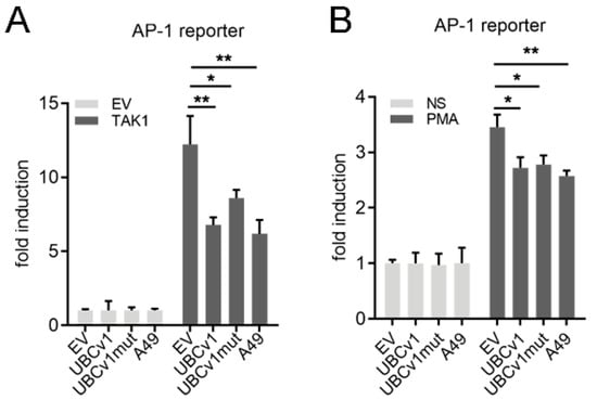 UBCv1 inhibited AP-1 transcription factor activation. HEK293T cells were transfected with pAP-1-Luc (250 ng/well), p-TK-Renilla (10 ng/well) and either 25 ng/well of UBCv1, UBCv1mut, A49 expression plasmids or empty vector (EV). (A) TAK1 (40 ng) inducer was also co-transfected. (B) 24 h after transfection, cells were treated with 10 ng/mL PMA for a further 8 h. Firefly luciferase activity was corrected with Renilla luciferase activity and normalized to non-stimulated (NS) empty vector (EV). Data are presented as mean ± SD and are representative of at least three experiments. Statistical analyses were performed using one-way ANOVA test (* p < 0.05; ** p < 0.01).