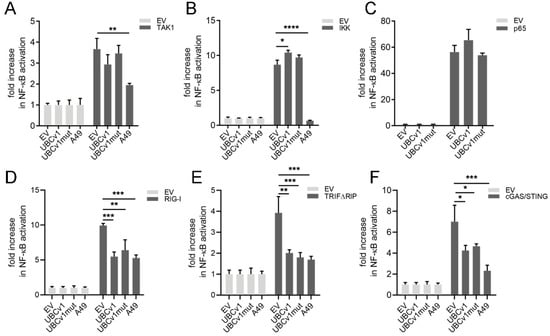 UBCv1 inhibitory activity mapped upstream of the IKK complex. (A) HEK293T cells were transfected with pNF-ĸB-Luc, p-TK-Renilla and UBCv1, UBCv1mut, positive control A49 expression plasmids or empty vector control (EV). Cells were stimulated by co-transfecting (A) TAK1 inducer (40 ng) (B) IKKβ signaling factor (50 ng) or (C) p65 (2 ng). Expression plasmids (D) RIG-I (40 ng), (E) TRIFΔRIP (40 ng) or (F) cGAS (20 ng) with STING (20 ng) were included as signaling factors in the initial transfection as indicated. Firefly luciferase activity was measured 24 h post- transfection and corrected with Renilla luciferase activity normalized to EV. Statistical analyses were performed using one-way ANOVA test (* p < 0.05; ** p < 0.01; *** p < 0.001; **** p < 0.0001).