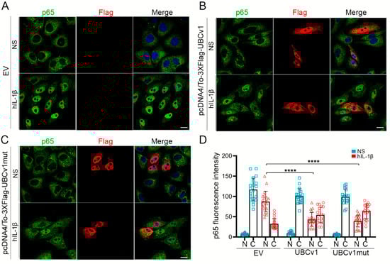 UBCv1 impaired p65 translocation into the nucleus. Representative images of HEK293T cells transfected with (A) pcDNA4/To (EV), (B) Flag-UBCv1 or (C) Flag-UBCv1mut and stimulated with IL-1β (50 ng/µL) for 30 min. Cells were then fixed, permeabilized and stained for Flag (green) and p65 (red). Non-stimulated (NS) transfected cells were used as controls. Protein localization was determined by confocal microscopy. Bar = 10 µm. (D) Quantification of p65 fluorescence intensity in nucleus (N) and cytoplasm (C) of transfected cells (EV, UBCv1 or UBCv1mut) in NS and hIL-1β conditions (n = 20). Statistical analyses were performed using one-way ANOVA test (**** p < 0.0001).