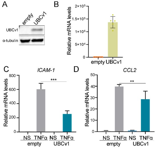 Finally, to confirm these data, we generated an A549 cell line stably expressing UBCv1 as described in the Materials and Methods section. First, we validated these cells lines (control and UBCv1) by western blot and quantitative PCR (qPCR). Expression of UBCv1 was readily detectable (Figure 6A,B). Then, we studied the expression of ICAM-1 and CCL-2, genes with NF-ĸB dependent promoters. A549-empty and A549-UBCv1 cells were stimulated with TNF-α for 6 h and ICAM-1 and CCL-2 were measured by qPCR. The expression levels of these genes were reduced in UBCv1-expressing cells compared to control cells (Figure 6C,D), confirming the ability of UBCv1 to block NF-κB transcriptional activity.