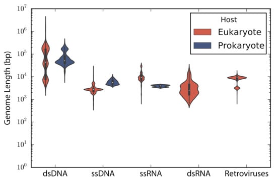 According to the type of genetic material stated in the description of the accessions, these were categorized into: double stranded DNA (dsDNA), single stranded DNA (ssDNA), double stranded RNA (dsRNA), single stranded RNA —despite the sense— (ssRNA), and retro-transcribing viruses (rt-viruses). A total of 1122 accessions did not have a complete taxonomic annotation at the moment of the study; those accessions were found to be either unclassified phages (66), unclassified viruses (80), satellites (203), or assemblies from marine metagenomes (773). The longest genome belonged to the dsDNA virus Pandoravirus salinus (NC_022098) with a genome length of 2,473,870 bp, whereas the smallest genome belongs to the ssRNA Lucerne transient streak satellite virus with 324 bp. In general, DNA viruses are larger than RNA viruses (Mann-Whitney test: p-value = 1.12 × 10). A comparison of the genome length distribution of phages and eukaryotic viruses shows that dsDNA and ssDNA phages tend to have larger genomes than dsDNA and ssDNA eukaryotic viruses (Mann-Whitney test when comparing dsDNA viruses: p-value = 7.19 × 10; Mann-Whitney test when comparing ssDNA viruses: p-value = 3.08 × 10). In the case of ssRNA viruses, eukaryotic viruses tend to have larger genomes than phages (Mann-Whitney test when comparing ssRNA viruses: p-value = 7.89 × 10) (Figure 1).