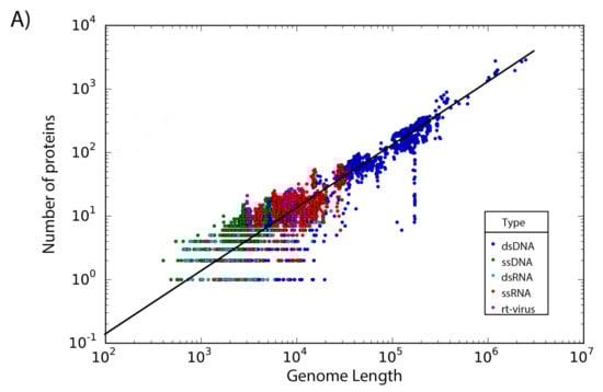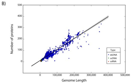 The set of 14,057 non-redundant genomes code for a total of 442,007 proteins, where we observe that the number of genes is directly proportional to the length of the genome. Interestingly, a linear regression suggests a gene density of 12 proteins per kilobase in the case of phages, while in the case of eukaryotic viruses the gene density is only about 2.5 proteins per kilobase; indicating a lower gene density for eukaryotic viruses in comparison with phages (Figure 2).