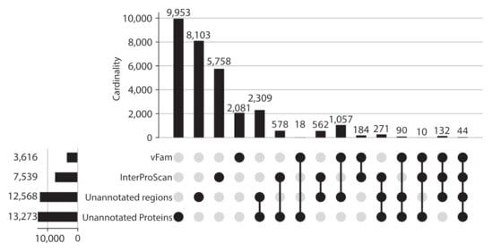 Given the proportion of unannotated sequences, protein regions without domain or vFam annotation were also considered for further analysis, meaning that the final set of viral regions consisted of: 365,368 annotated regions (309,251 InterPro domains + 56,137 vFam matches), 157,591 unannotated regions of at least 40 residues (69,333 regions in between annotated domains + 88,258 regions in between vFam matches) and 170,637 unannotated proteins (proteins with no hit to vFam or InterProScan). The set of orthologous groups was built from the symmetric best matches between viral regions using the software COGsoft [4] (see methods). A total of 31,150 ViPhOGs with at least three members were obtained. Interestingly, most of the ViPhOGs were built from a single type of viral regions: unannotated proteins (9953), unannotated regions (8103) or annotated regions (8023). Among all possible combinations of viral region types, the highest number of clusters was obtained for the combination of unannotated proteins and unannotated regions (2309) (Figure 3). This suggests that although the vast majority of regions and proteins in viral genomes are uncharacterized, they are conserved among the different chosen viruses.