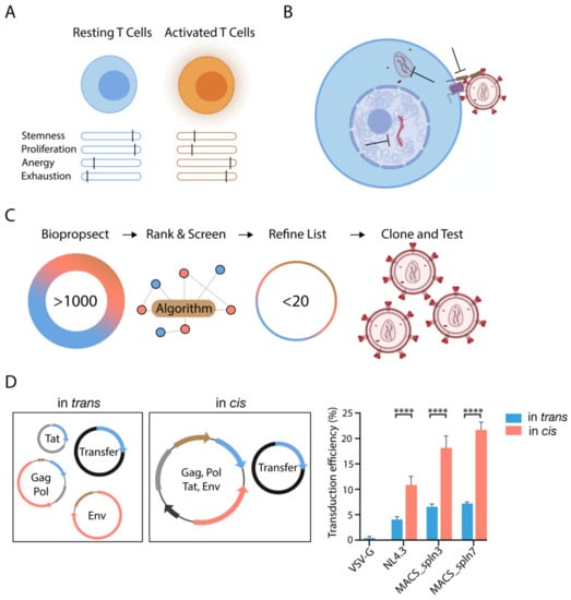 Presiding methods largely focus on the transduction of activated T cells [,], and thus develop a product that may be suboptimal in function due to prior activation and proliferation that may lead to cellular exhaustion and anergy. This frames a limited window of therapeutic effect due to limitations to those cells’ ability to expand and/or function in vivo (Figure 1A). The utility of resting T cells in the gene/cell therapy arena thus presents several clear advantages. However, there are several factors that impose firm limits on resting T cell therapy being widespread and can be divided into two distinct spatial-temporal events. Firstly, current vectors utilize pseudotypes that are biologically incompatible with attaining entry in resting cells at two levels, initially due to low receptor density on the cellular surface []. Secondly, there is limited membrane turnover and particle passage into resting T cells []. Despite vector binding, this could provide a significant bottleneck for glycoproteins that require specific vesicular triggers (e.g., lowered pH or cathepsin cleavage). The second major limitation of gene delivery in resting T cells is beyond the membrane. This presently consists of known and unknown number of lentiviral restriction factors that influence vector core uncoating, reverse transcription, integration, and finally gene expression. Thus, any attempt to efficiently genetically manipulate resting T cells needs to make the vector particle compatible to these two key roadblocks (Figure 1B). In addition, this philosophy can be expanded to gene therapy vectors in general: No one vector particle is able to efficiently meet the needs of all cell types, and rather than retrospectively adjusting “the playing field” by changing the cell (e.g., T cell activation or electroporation), we need to consider the foundations of the vector particle itself. As to how we can change these foundations, we need to look closely at how viral families already navigate these challenges and to what extent we can safely bioprospect and harvest key elements to build a vector particle that is better suited for its job of gene delivery and/or editing.