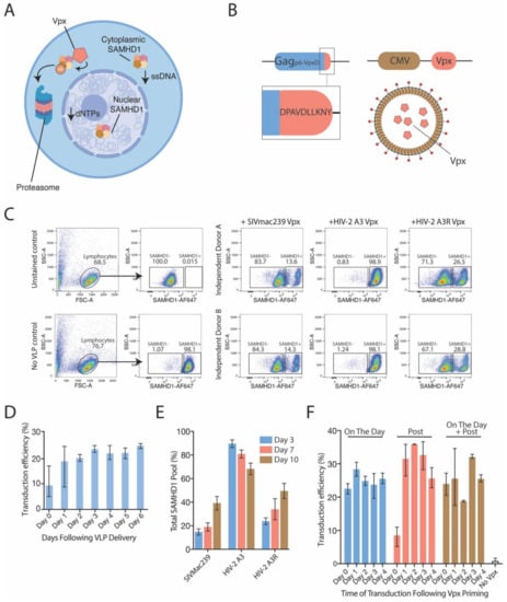 Further suppression of vector function is mediated by intracellular restriction factors. One key restriction factor, SAMHD1, has been determined to be a major contributor to resistance against lentiviral transduction, particularly in terminally differentiated myeloid cells such as macrophages, dendritic cells, and also resting T cells [,] (Figure 2A). SAMHD1 exists within the nucleus and in the cytoplasm, as dimeric and multimeric forms, which have been shown to degrade nascent transcripts, lower dNTP levels to concentrations that inhibit reverse transcription and integration, and possess innate immune functions, such as the ability to sense and bind to intracellular single-stranded nucleic acids [,]. In resting cells, SAMHD1 is present in an active, unphosphorylated form, whilst in dividing cells, SAMHD1 is phosphorylated and largely inactive. Thus, the inactivation or the elimination of unphosphorylated SAMHD1 may well increase the transduction opportunity of each vector. Many SIV and related HIV-2 isolates have evolved the ability to counter SAMHD1 restriction. In brief, an ancestral lineage of SIV originally duplicated the Vpr accessory gene and from that duplication event Vpx evolved and is present in modern lineages of SIV and HIV-2 []. How this could be harvested and used in HIV-1-based lentiviral constructs was observed when Sunseri and colleagues identified the minimal motif located in the SIV Gag p6 that could enable Vpx binding and packaging in viral particles [].