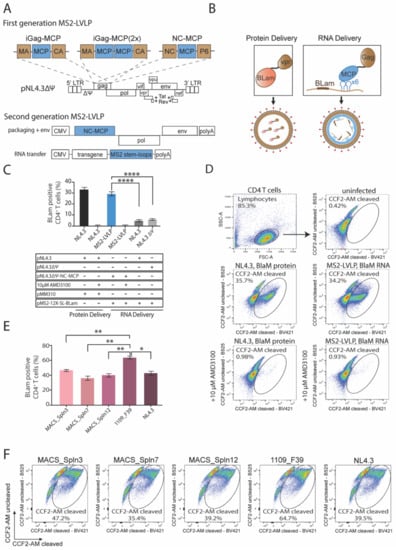 To determine the potential of expressing transgenes without formally necessitating reverse transcription, we engineered non-integrative MS2 lentivirus-like particles (MS2-LVLPs) by fusing the MS2 coat protein (MCP) to the nucleocapsid (NC), as shown in Figure 3A. Importantly, these first-generation MS2-LVLPs are lacking the ability to package genomic RNA due to the absence of the HIV-1 packaging signal Y. Fusion of the MCP monomer (iGag-MCP) or a head-to-tail dimer (iGag-MCP(2×)) to the C terminus of p17 did not result in efficient particle production 72 h post-transfection (data not shown). To produce MS2-LVLPs that efficiently package sensor RNA, we fused 12 MS2 stem-loops to beta-lactamase on a CMV-driven RNA transfer vector (pMS2-12X-SL-BlaM) and co-transfected the construct alongside the first-generation LVLP plasmid (pNL4.3DY-MCP-NC) into HEK293T cells. As schematically illustrated in Figure 3B, the delivery of the vpr-BlaM fusion protein packaged by pNL4.3 served as a positive control to benchmark the RNA delivery efficiency of MS2-LVLPs against the delivery efficiency of BlaM protein. The transduction of resting CD4+ T cells with unconcentrated first-generation MS2-LVLPs resulted in a delivery efficiency of biologically active sensor RNA of 29.45%, whereas the efficiency of NL4.3DY and NL4.3 to package sensor RNA was significantly reduced (Figure 3C,D). To investigate whether the transient expression of sensor RNA is solely dependent on a gp120-CXCR4-based entry mechanism, we incubated resting CD4+ T cells with the CXCR4 antagonist AMD3100 prior to transduction, which resulted in a reduction of delivery efficiency to <1% (p < 0.0001).