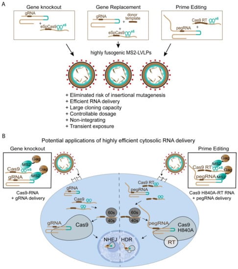 Overcoming current limitations of viral vectors in the era of genetic engineering and gene therapy through MS2-LVLP-based cytosolic RNA delivery. (A) Summary of advantages of transient ‘hit-and-run’ genome editing using MS2-LVLPs. (B) Simplified schematic of transient RNA delivery in the context of current gene editing technologies using cell-specific, non-integrating MS2-LVLPs.