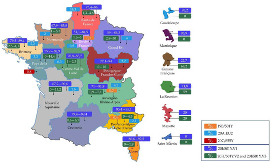 Percentage of three suspected variants of concern (20I/501Y.V1, 20H/501Y.V2, and 20J/501Y.V3) according to screening tests undertaken in France (7 April 2021), and percentage of 19B/501Y, 20C/655Y, and 20A.EU2 according to #5 Flash survey sequencing results (17 March 2021) [34]. (Designed by comersis).