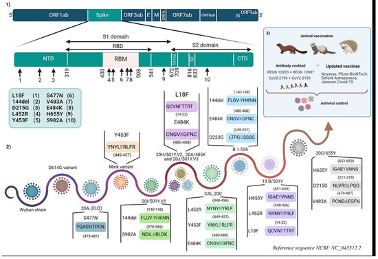 - Hammer, A.S.; Quaade, M.L.; Rasmussen, T.B.; Fonager, J.; Rasmussen, M.; Mundbjerg, K.; Lohse, L.; Strandbygaard, B.; Jørgensen, C.S.; Alfaro-Núñez, A.; et al. SARS-CoV-2 Transmission between Mink (Neovison Vison) and Humans, Denmark. Emerg. Infect. Dis. 2021, 27, 547–551. [Google Scholar] [CrossRef]